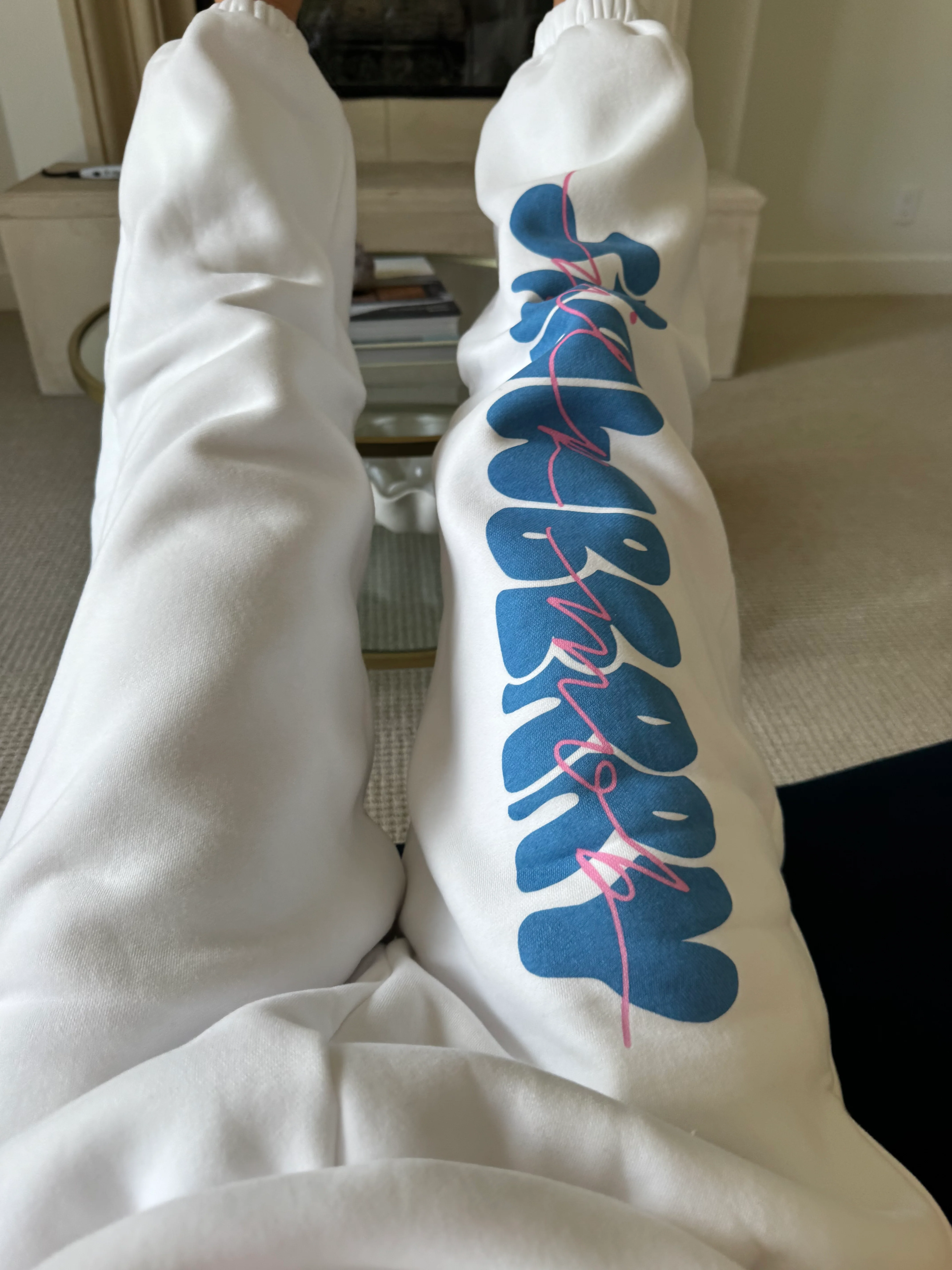 Make major moves in the Milkchella Sweatpant—your limited edition uniform for dancing 'til sunrise, crashing campfire hangouts, or just cozying up post-swim or festival. These crisp white sweats feature bold “Strawberry Milk Mob” graffiti-style lettering down the front leg and a cheeky little SMM pool-ball graphic right on the booty (because why not have a little fun back there?). Soft, plush, and made to match your Milkchella Crewneck and T-Shirt, these are the pants you’ll live in long after the lights go down.