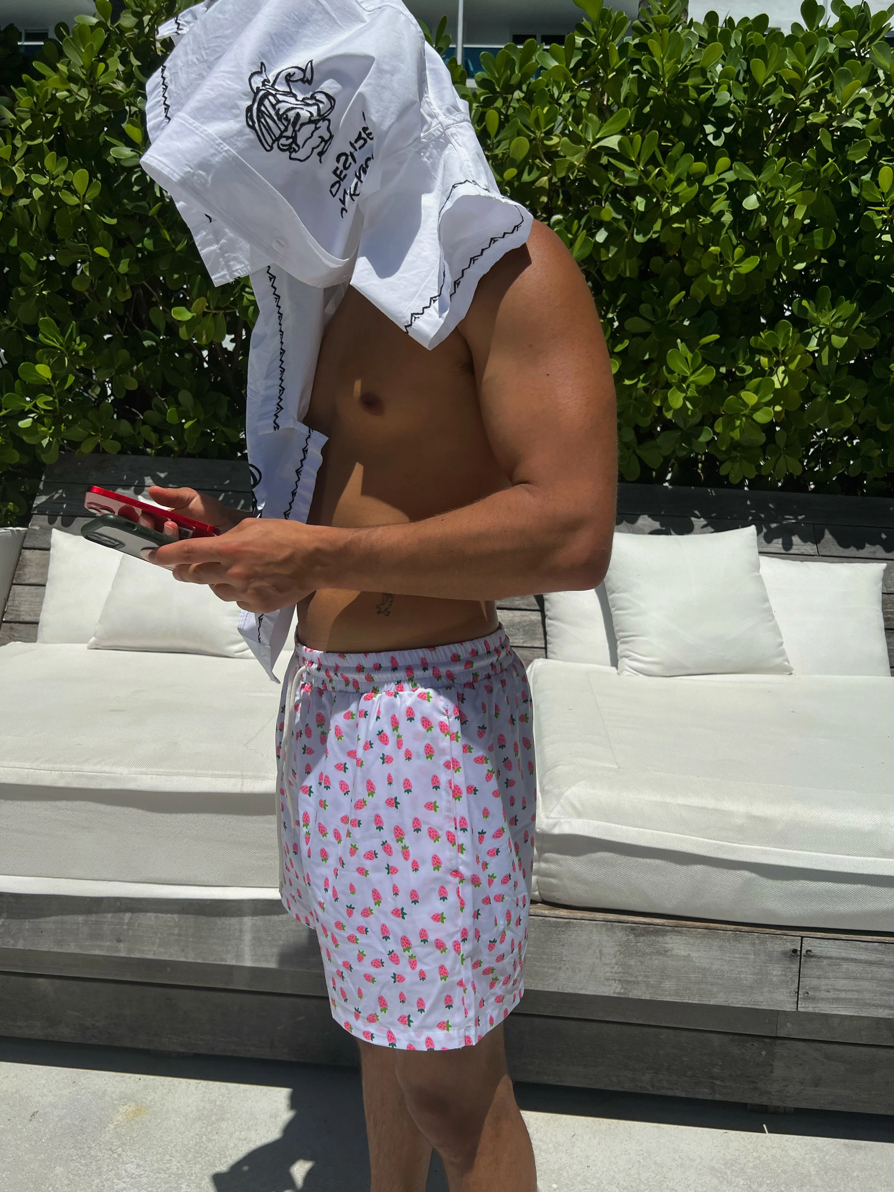 The Strawbaby shorts are the perfect blend of style and comfort designed for men's swim and lounge. These swim trunks, featuring a loose fit with mesh lining, are your ticket to relaxation and casual cool. With 2 side pockets, complete with secret zipper compartments, you can keep your essentials secure while enjoying carefree moments. The tie-string waist ensures a customizable fit, similar to Lulu Lemon sizing, while the 5.5 inch inseam strikes the perfect balance between style and freedom.